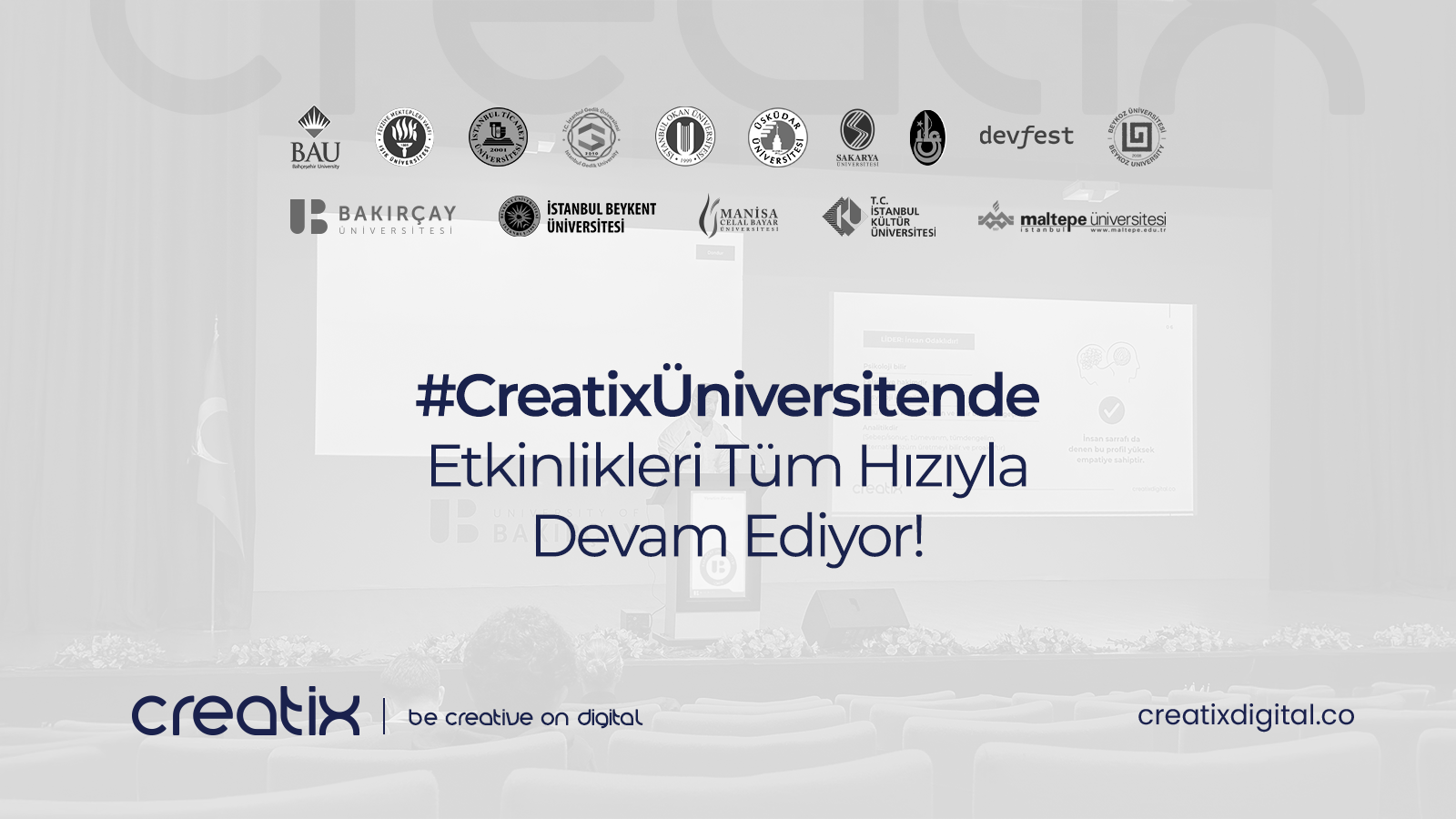 Creatix Digital olarak Türkiye'nin dört bir yanındaki üniversitelerde düzenlediğimiz, geleceğin liderleri ve pazarlama profesyonelleri ile bir araya gelerek, kurucumuz ve CEO'muz Mehmet Safa Yalçıntaş’ın konuşmacı olarak katıldığı bu etkinliklerde; Liderliğin DNA’sı, Pazarlamanın Dijital Vizyonu ve Kariyerin Dönüşen Genetiği gibi güncel ve önemli konuları ele alıyoruz.